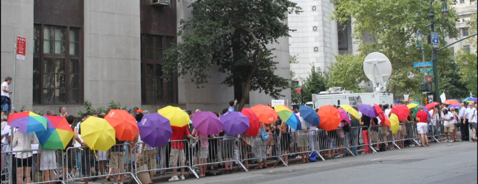 supporters brought umbrellas to shield the couples waiting in line at city hall from protesters with "god hates fags" signs