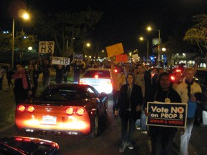The day after the election that put Obama into office, the second headline on the front page predicted Proposition 8 to pass. Devastated and incredulous, I read the headline through the plastic door of a newspaper stand on the sidewalk, and wept openly. Later that day, while sitting at my desk at Real Estate Job, I got a text from a number I didn’t recognize asking me (and others) to meet at Santa Monica Blvd. and San Vicente to protest. By 9pm, we had blocked off traffic along Santa Monica, and began marching east.