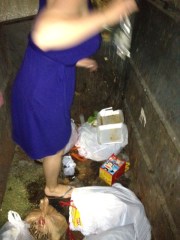 I took the elevator back downstairs to the garage, found an old towel to drape over the edge of the dumpster, laid a recycling bin on its side, and watched the hilarity ensue (and took pictures, of course). Back upstairs, we spackled up some holes, I grabbed whatever I had left there, plus the mysterious luggage, and drove away. I reached the freeway before I realized that I had forgotten to pass of my keys to Teacher Roommate.
