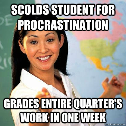 -I write this the day after the last class: 1/3 of my assignments remain ungraded. In addition, none of my class participation points have been posted. If I have received credit for going to class, I have yet to see evidence of it in the grades section of the online platform. Of all the forum postings, papers, and class time scores (not counting the final paper, for which the due date has not yet passed), only seven of the 23 scores possible (30%) for this class have been graded and put on the online platform. When a student asked Inept Instructor a month ago if he would be putting more of our grades up, Inept Instructor replied, “I think you’ve figured it out…I’m slow 🙂 Your analysis papers are graded and posted. I will be assigning individual forum posting and class participation grades.” The latter statement, at least, has proven to be untrue. I wonder what he thinks the purpose of the “grades” section of the online platform is, if not to PUT OUR GRADES UP.