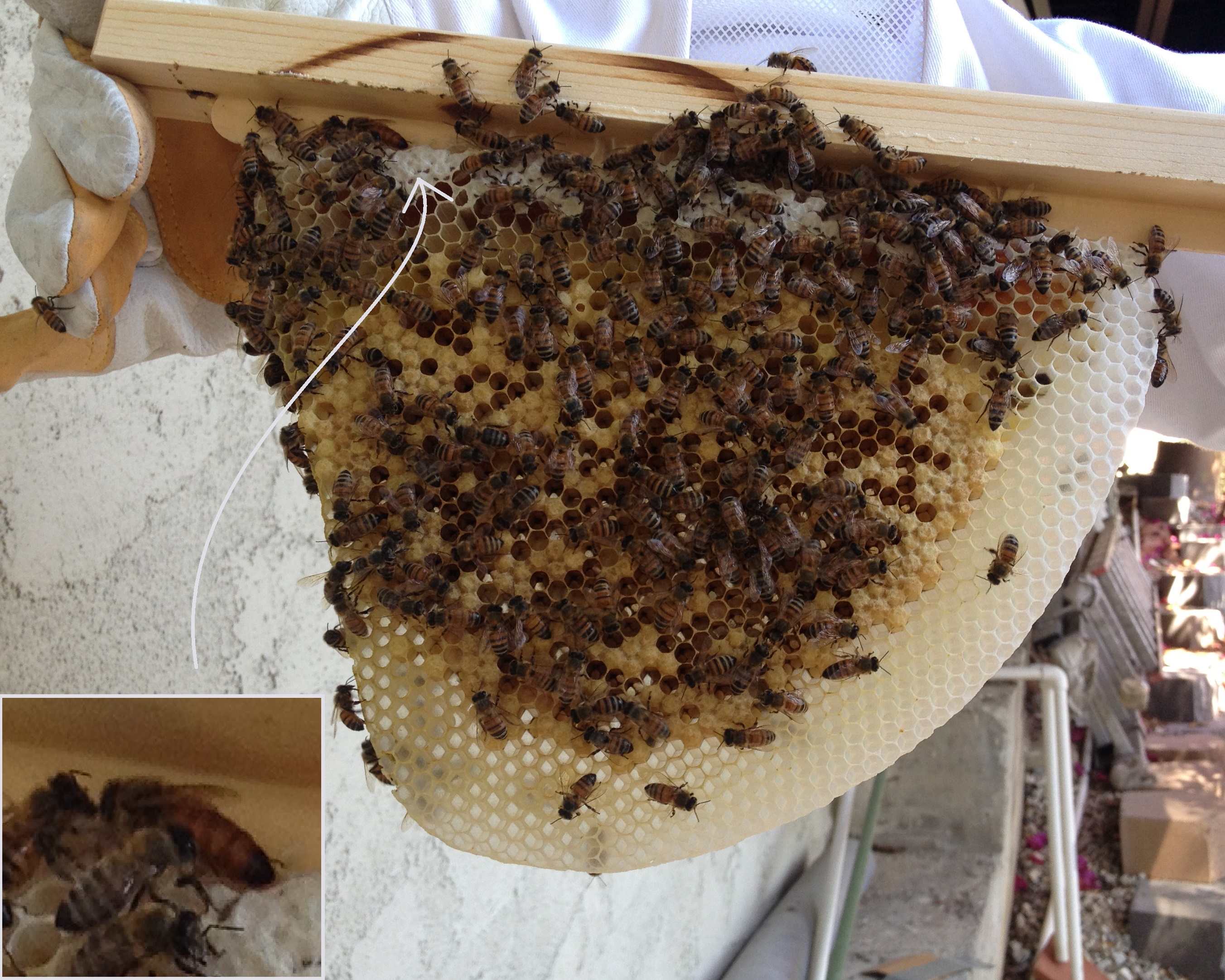 Dad and I checked out the hive yesterday to see if the queen was still there since half the colony seems to have absconded.  We found her!  He pulled out three bars with comb on them before we found her.  The comb looked gorgeous.  The honey glowed, and there were a few spots where you could see actual larvae.  Very exciting.