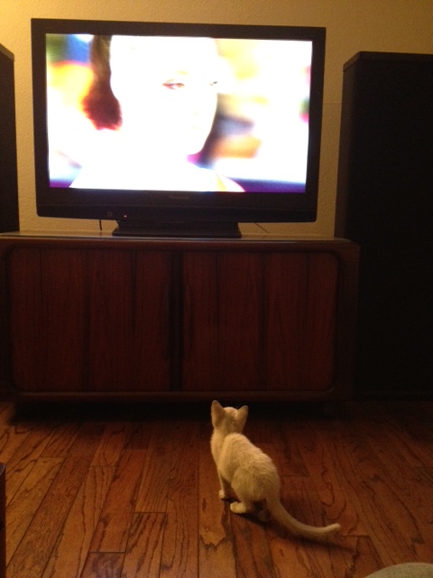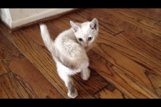In fact, there’s no shutting him up, lol. He walks around and chases after our feet, wolfs down food at an alarming rate, makes a huge mess of the bathroom where we’re keeping him, and meows constantly. The only times he’s quiet is when he’s eating or sleeping (usually behind the refrigerator where it’s warm). He seems particularly fond of the TV, and stood staring at a United States Olympic gymnast (now a gold-medal winner) for a solid 30 seconds last night. He has just started looking up at things, and has a hilarious little trot. He has yet to master turning left (poor lil’ Zoolander), which might be due to the damage in his right ear and eye (I think the blood on his face when I found him came out of his ear, since it wasn’t coming out of his mouth).