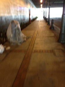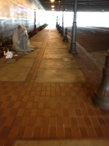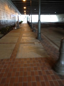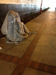 I walk under the freeway to get to Office Job from my parking structure four days a week.  Half the time there’s a homeless man who has taken up residence on a street corner that I frequent on my jaunt to work.  When it rains he goes under the freeway to stay dry, takes out the big sheet of semi-transparent plastic he keeps his stuff under, and hides under it himself.  I’m not sure if he does this to make sure he doesn’t get wet (despite the fact that the freeway does a stellar job of this already), or to stay warm.