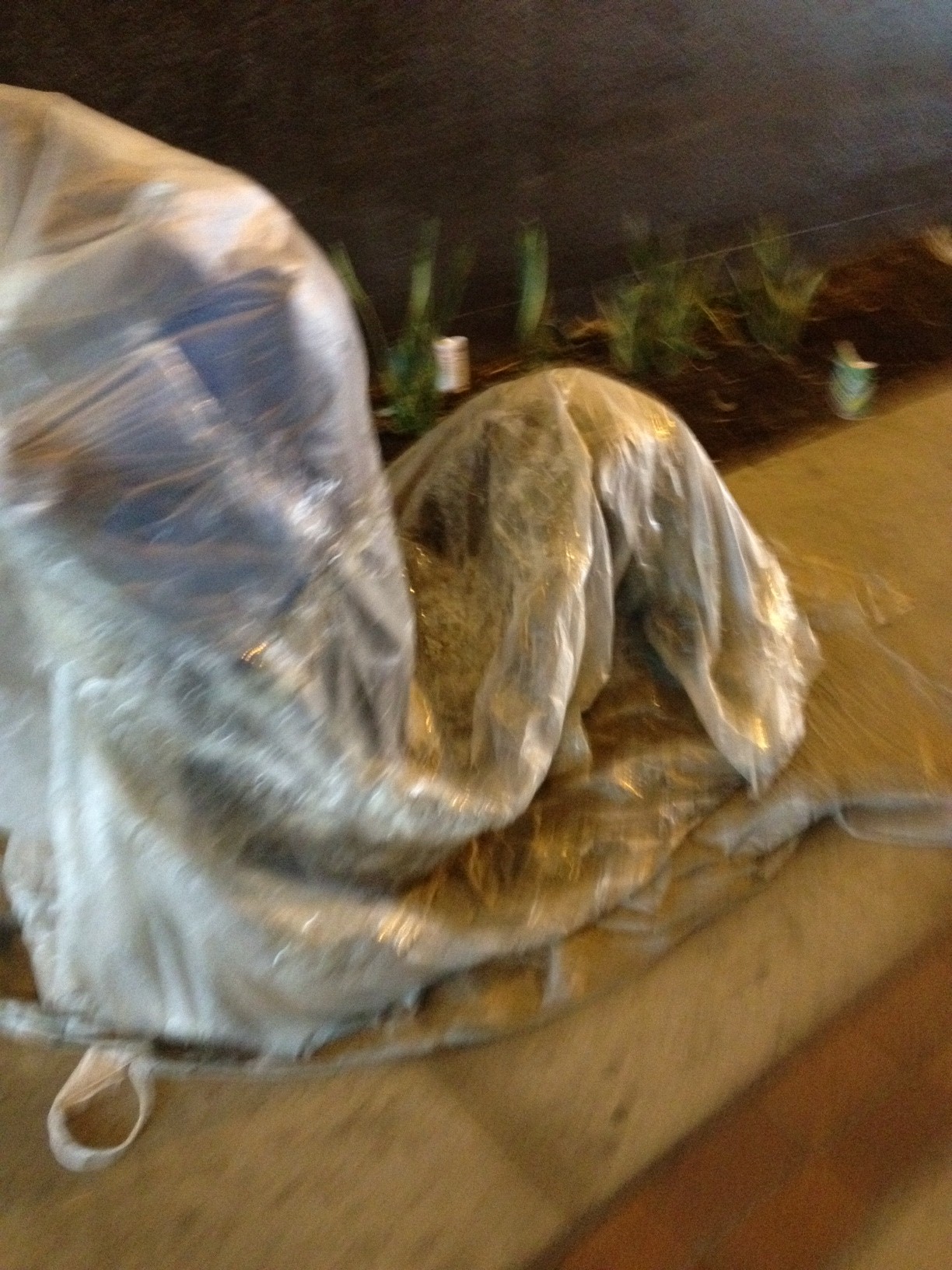 Today it rained.  Per usual, he was under the freeway and wrapped in plastic.  Per usual, the visual he creates freaked me out a little.