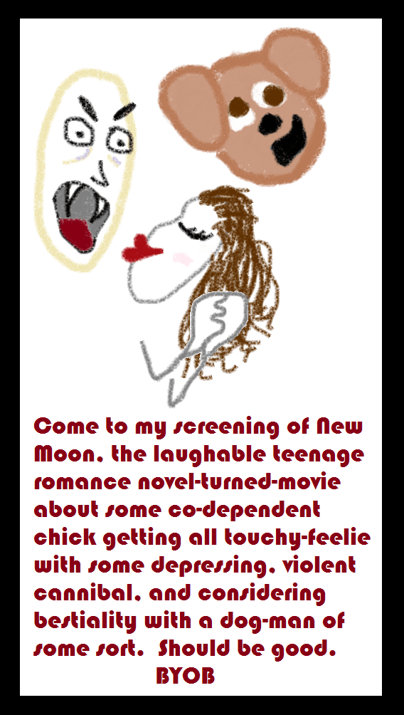 I’ve hosted a screening for the first Twilight movie, and the fourth one is already out in theaters (I think). It’s past time to host a screening for the second one, so that’s what we’re doing this Saturday (tomorrow) night. Board games at 6, ramen or Fancypants Farms for dinner, then movie around 8. Then probably more board games. This is how I live my life. If only I could make posters.